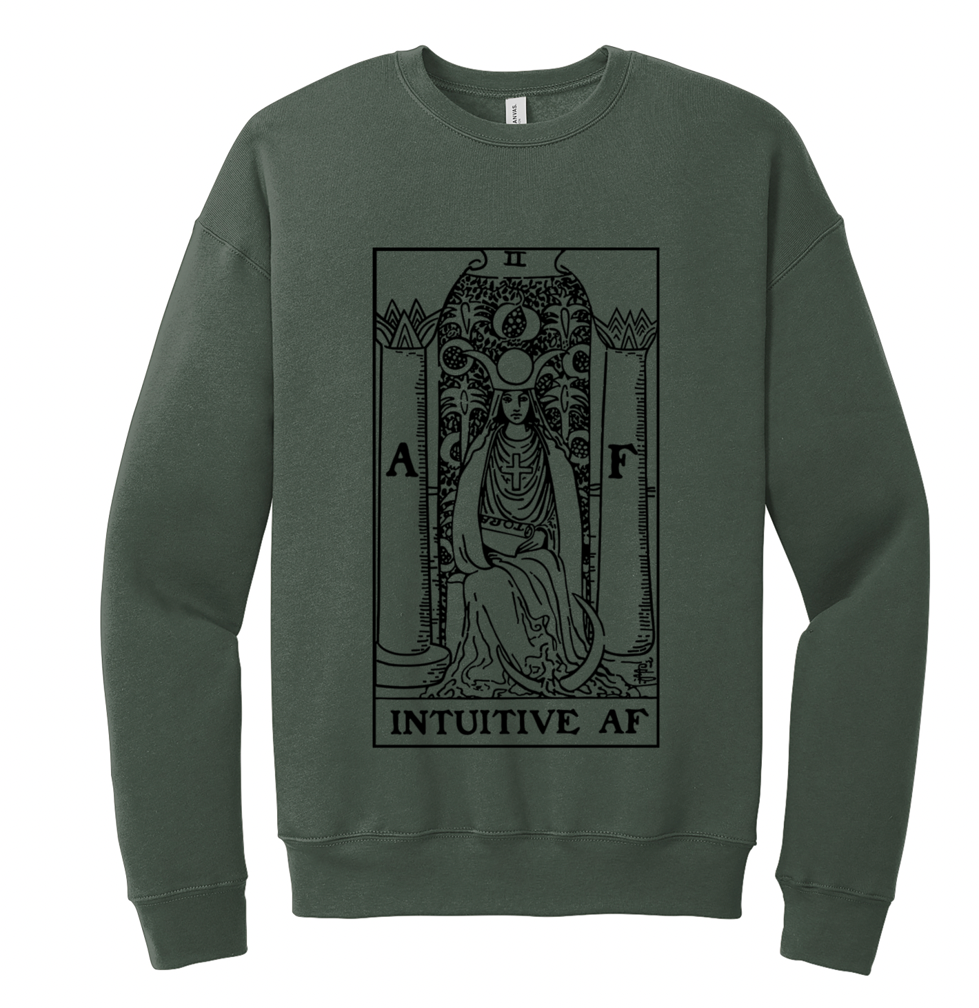 The “She Who Is Intuitive” Crewneck is our modern play on the High Priestess, now embodied as “Intuitive AF.” She calls us to reclaim our power by channeling and trusting the often silenced voice of inner knowing. She appears in the archetypes of Persephone and Artemis, wearing the crown of Isis upon her head. She sits between the Pillar of Establishment and the Pillar of Strength, the two opposing forces that represent the duality of nature. The High Priestess serves as the third pillar, the bridge between them, the symbol of balance itself.