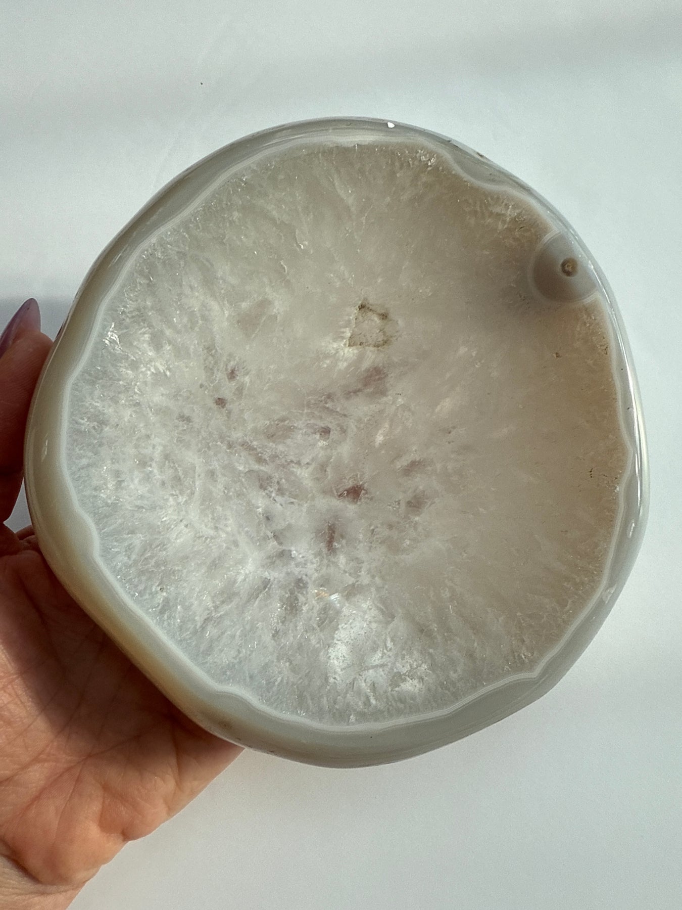 The bowl form gives the stone a practical purpose. You can keep it on an altar, in a living room, on a bedside table, or anywhere you want a grounded catch-all. Keys, jewelry, crystals, and small personal pieces sit well inside it. People often use Agate bowls to recharge items or give them a stable resting place, and the stone supports that without any extra ritual required. Over time it becomes one of those pieces you reach for naturally, because it keeps the space around it organized and quietly intentional without feeling forced.