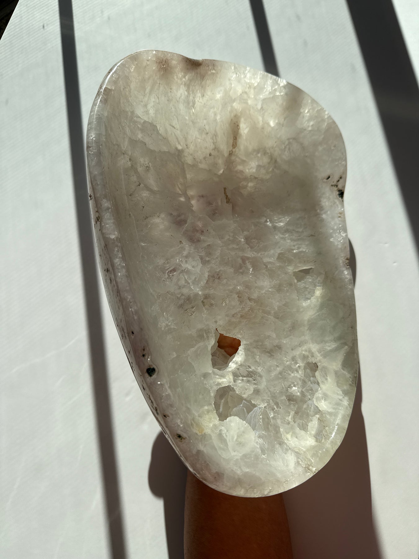 This Pink Amethyst and Quartz bowl stands out because of the way the two minerals meet inside the stone. The natural blush of Pink Amethyst blends into the clearer sections of Quartz, creating a mix of color and structure that looks intentional even though it formed on its own. The bowl has enough weight to feel substantial in the hand, and the stone shows its character through subtle patterning, veining, and shifts in tone. It is a statement piece because of the material itself, not because of anything exaggerated or forced.