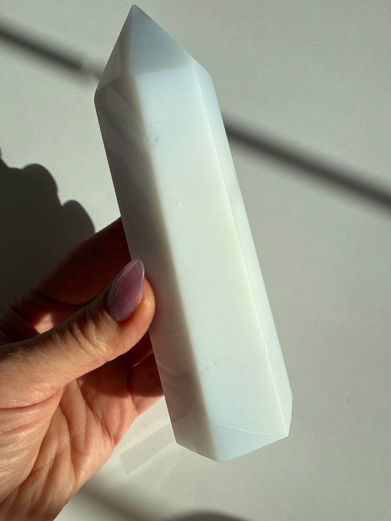 Chalcedony also carries a protective quality that is subtle but effective. It does not shield through heaviness. Instead, it lifts the emotional field just enough to create space between you and whatever pulls you off center. This is where the divine aspect of the stone comes through. Chalcedony does not impose direction. It brings you back to the quiet place inside yourself where truth is easier to hear and easier to speak. The tower shape gives that clarity a steady line to follow, making it a supportive piece for anyone working through communication, self expression, or emotional alignment. Each tower is selected for its brightness, its structure, and the calm strength within the stone, creating a piece that works well in both daily spaces and deeper personal practices.