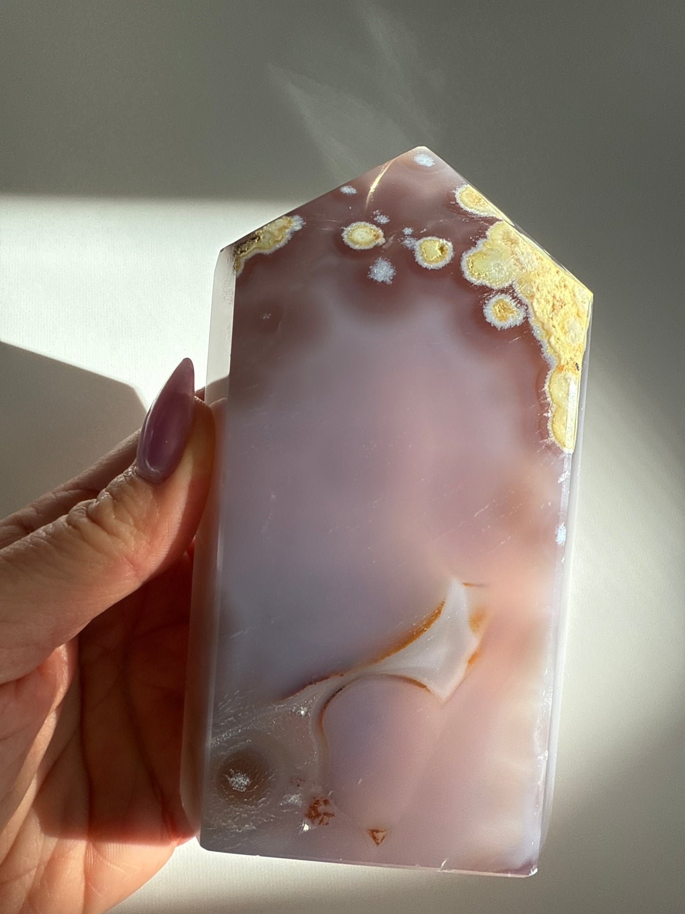 In tower form, these qualities become more focused. The shape helps direct the energy upward, which supports clarity, decision making, and forward movement. Many people keep Agate towers on their desk, altar, or bedside table because the stone creates a sense of order without demanding attention. It helps the space feel more manageable, and it quietly reinforces whatever you are building or working toward.