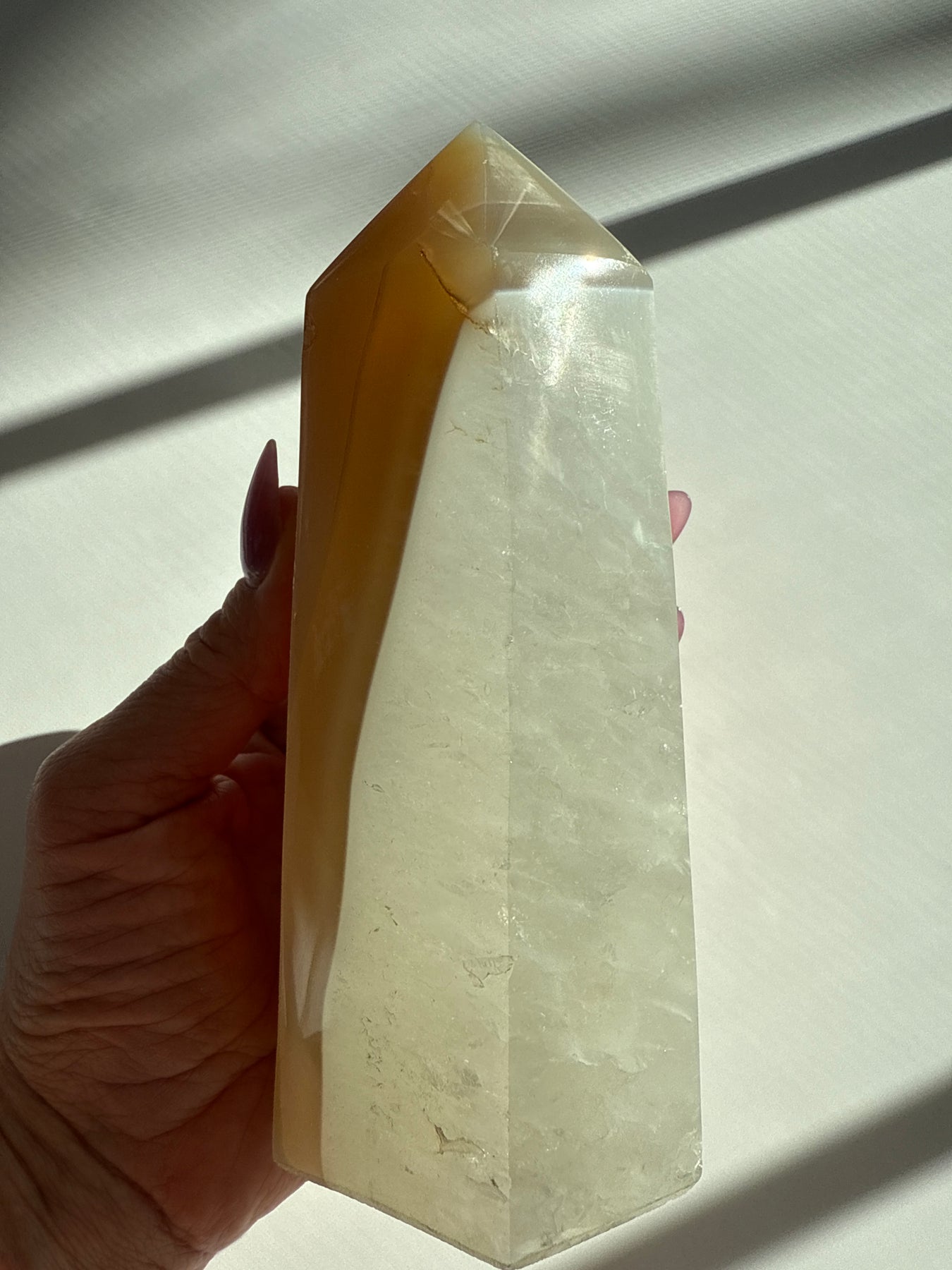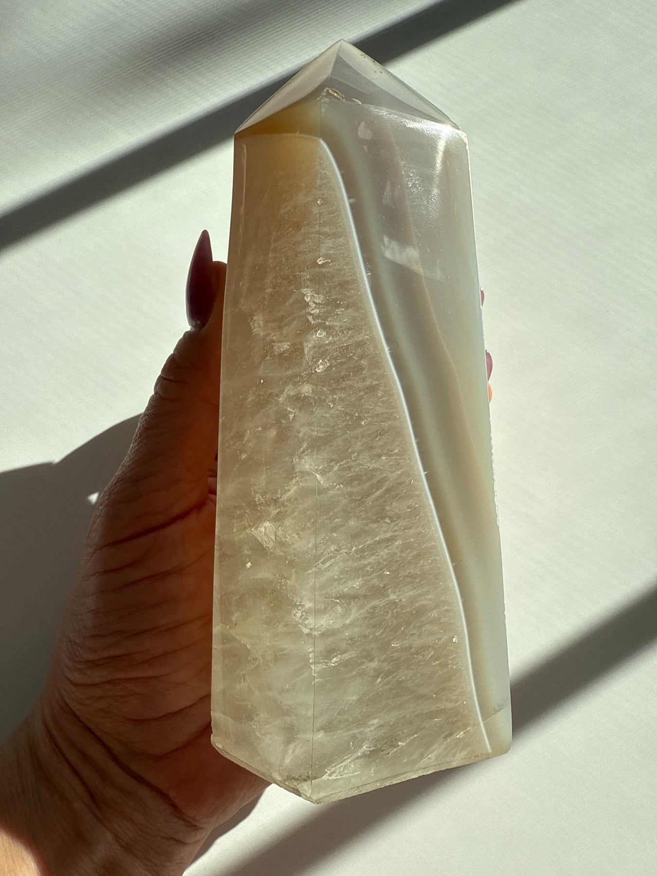 The Agate tower carries the same steady, grounded quality that Agate is known for, but the vertical shape gives it a sense of direction and focus. The banding, movement, and natural layers rise through the stone in a way that feels intentional, even though it formed on its own. Each tower is chosen for the strength of that movement and the way the patterning gives the stone depth without overwhelming it. Agate can look soft on the surface, but there is always a stronger current underneath. It holds a kind of gentle firmness that feels patient and quietly supportive.