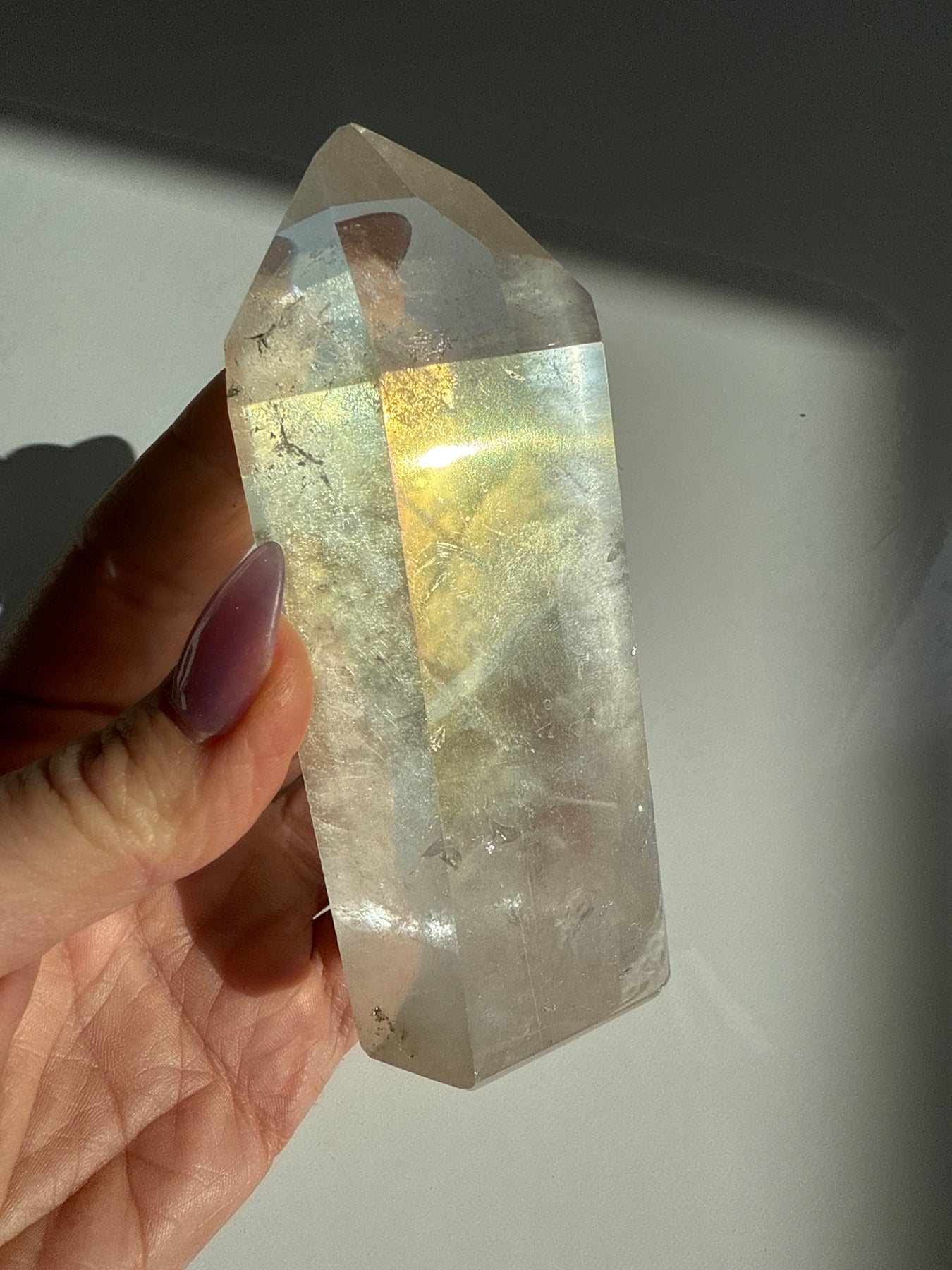 Unlike clusters that disperse energy outward in multiple directions, a single Aura Quartz tower channels energy with precision. It directs high-vibrational energy through its tip, making it ideal for focused intention work, manifestation, and energy healing. When placed in your space, whether on an altar, desk, or in a meditation zone, the point serves as a beacon of light, helping to center and elevate the environment around it.
