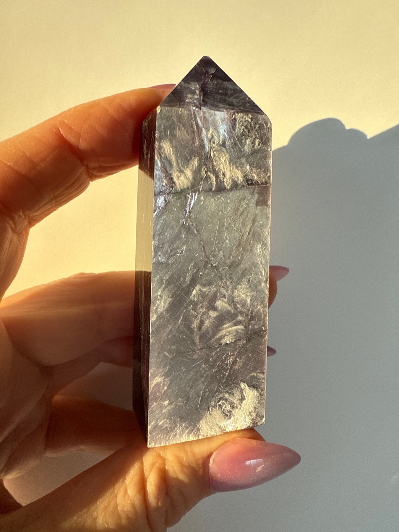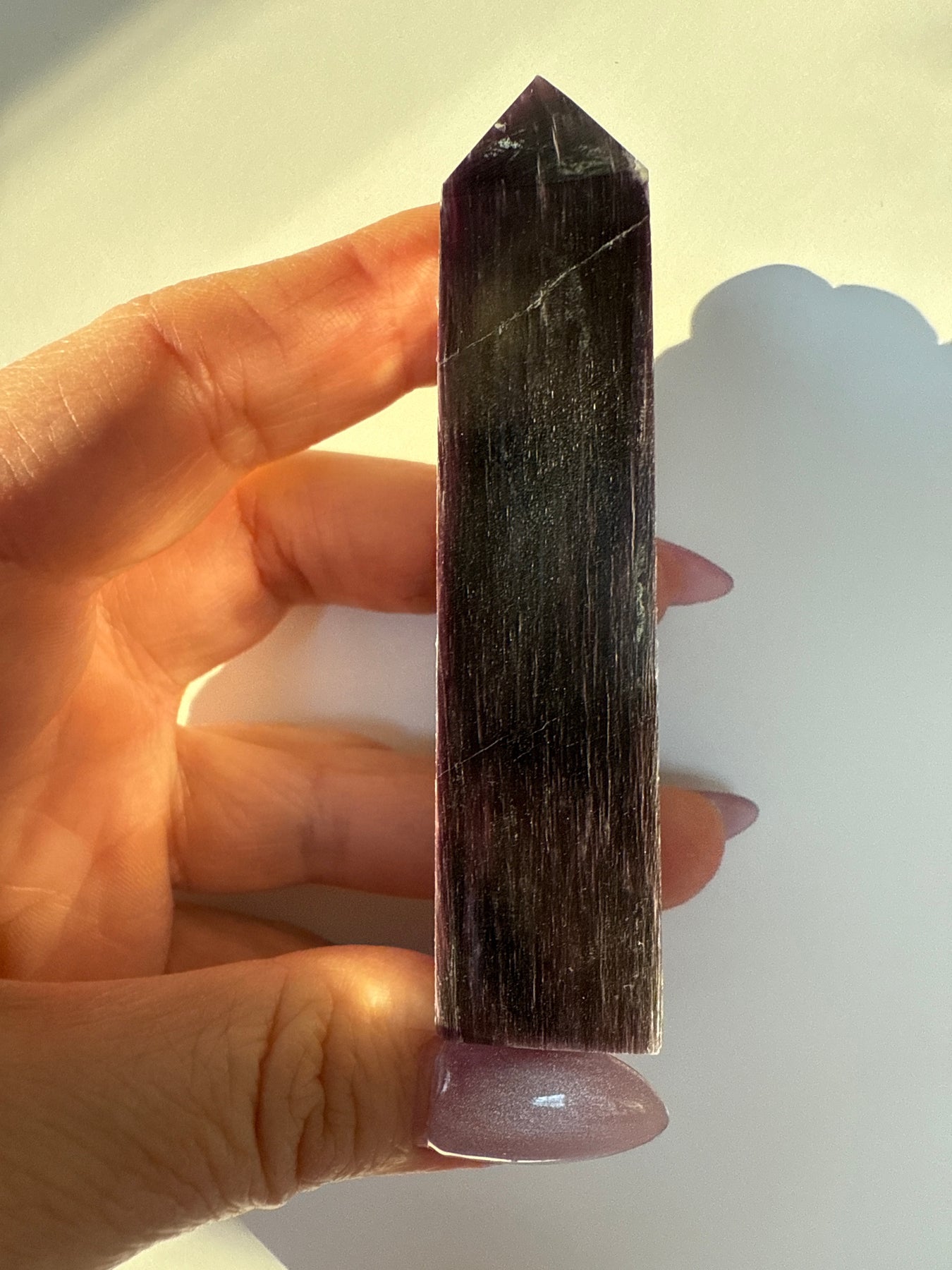Each obelisk is selected for its depth of color, the reflective mica surface, the integrity of the Quartz inclusions, and the stability of the carving. This is a piece for someone who resonates with emotional healing, nervous system repair, and inner quiet. It is both mineral rarity and energetic support in the same stone. If you are drawn to Lepidolite at its highest expression, this obelisk stands in that space fully.