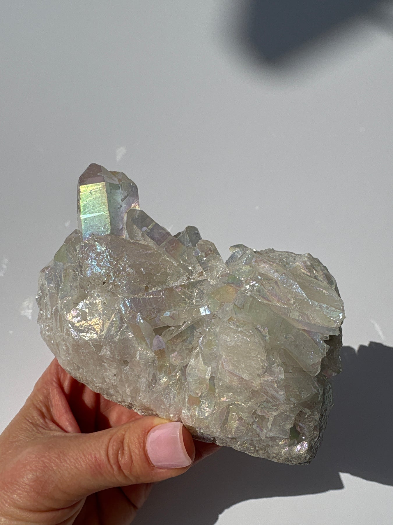 Aura Quartz is a breathtaking stone created by bonding Clear Quartz with precious metals such as white gold. This process enhances the natural properties of Quartz, elevating its ability to bring clarity, healing, and high-frequency energy. These clusters radiate a harmonious vibration that balances and cleanses the aura while amplifying spiritual connection. The metallic coating works in synergy with the natural Quartz to strengthen its energy field, offering enhanced healing properties.