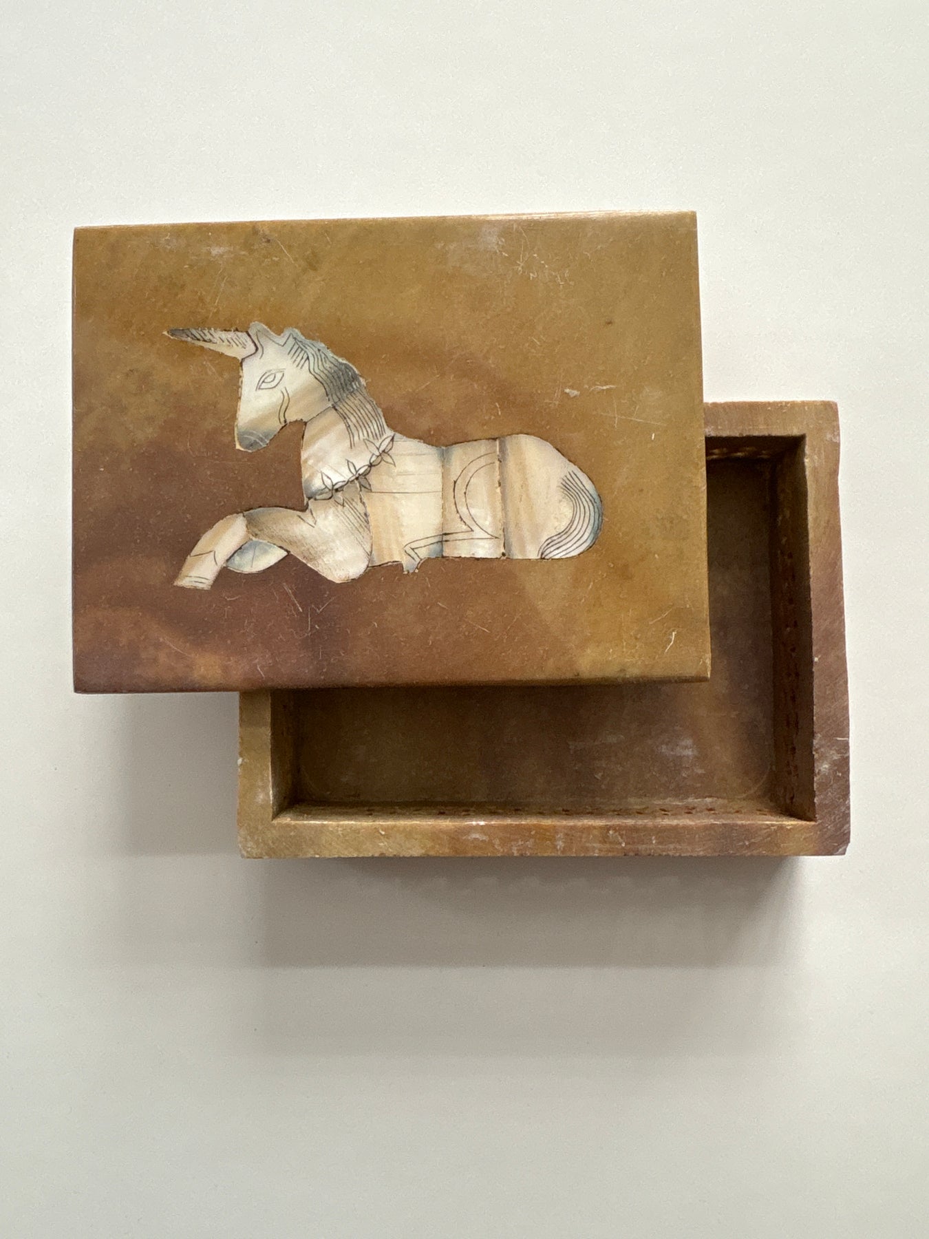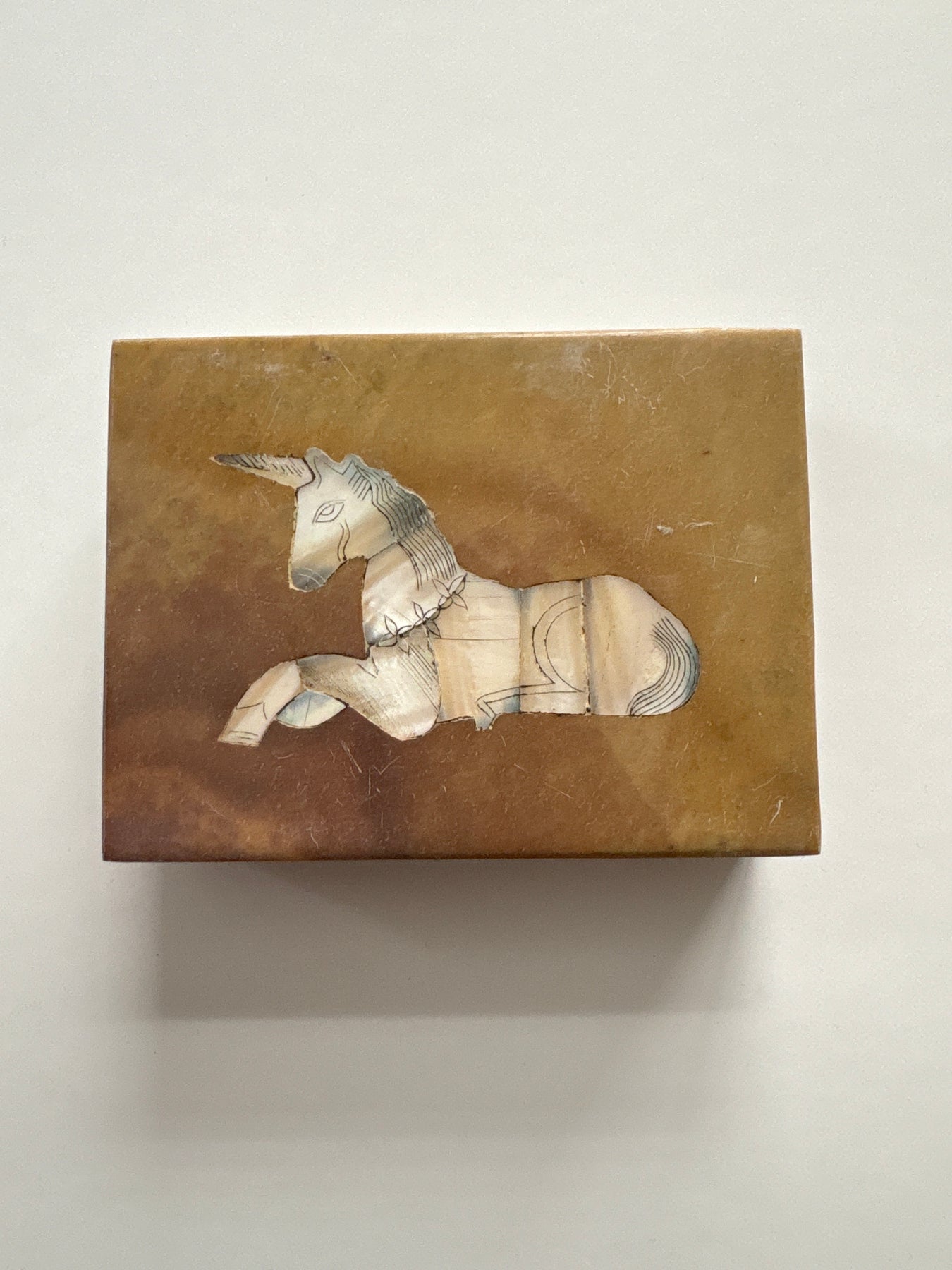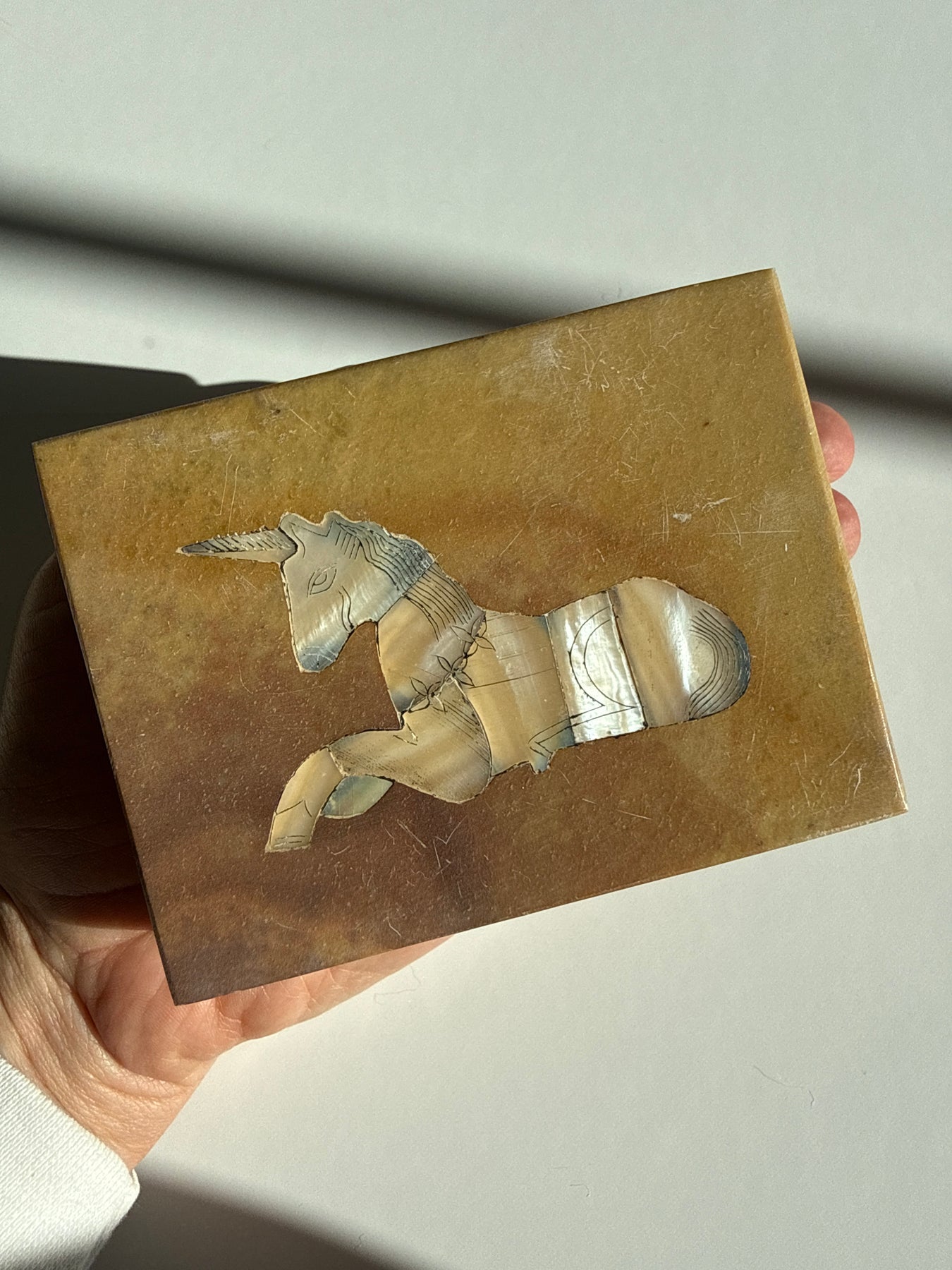 This piece carries the quiet symbolism of the unicorn, a timeless emblem of intuition, protection, and faith restored. The Mother of Pearl unicorn inlay on the lid reflects light softly, creating a subtle iridescence that feels soothing rather than flashy. The weight and smoothness of the stone give the piece a grounded presence, making it feel steady in the hands and calming in a space.
