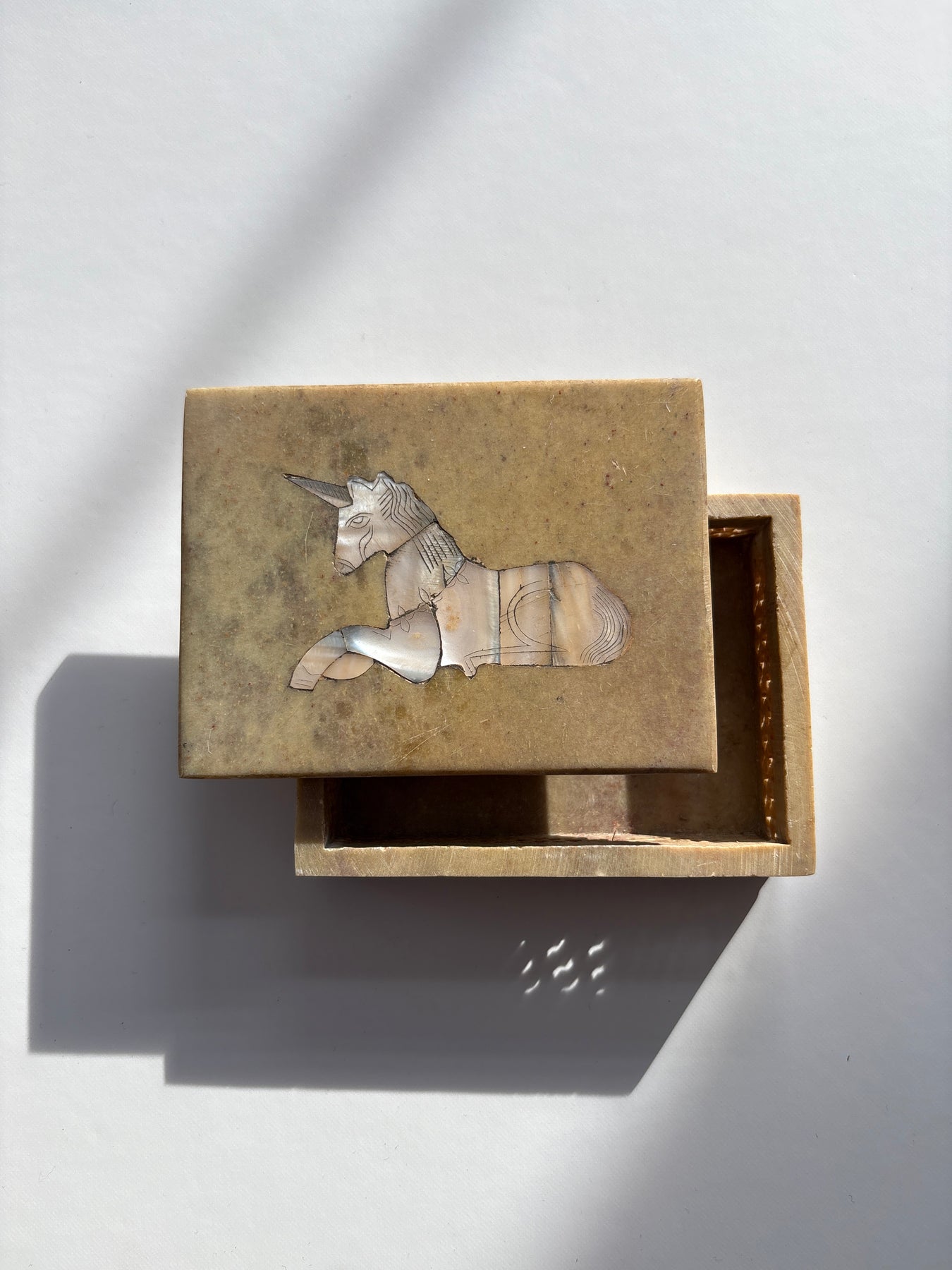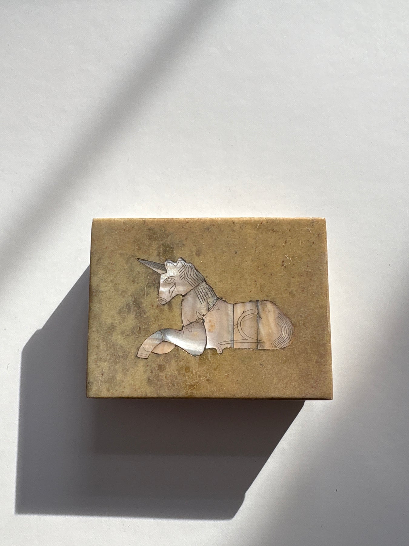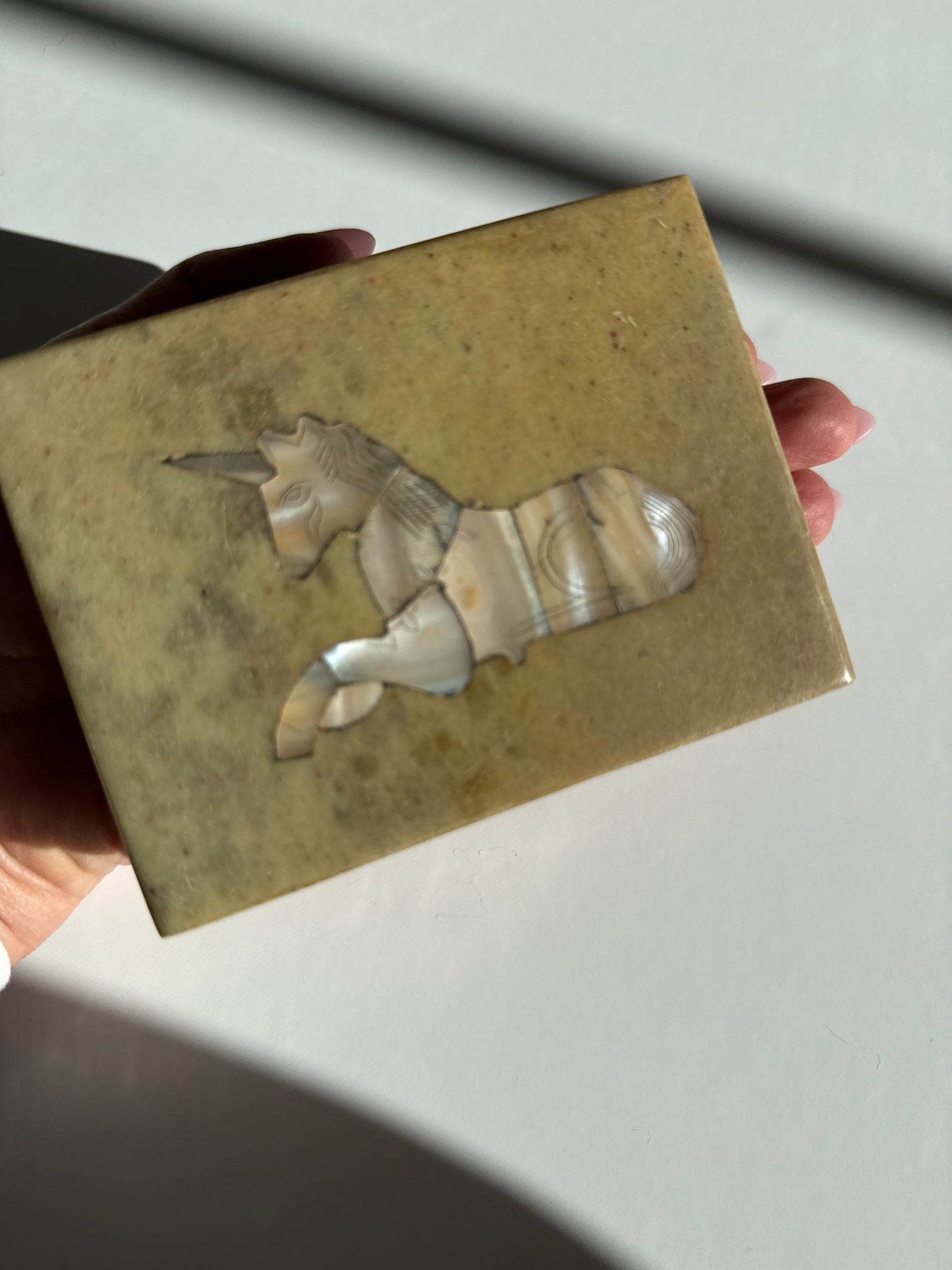This piece carries the quiet symbolism of the unicorn, a timeless emblem of intuition, protection, and faith restored. The Mother of Pearl unicorn inlay on the lid reflects light softly, creating a subtle iridescence that feels soothing rather than flashy. The weight and smoothness of the stone give the piece a grounded presence, making it feel steady in the hands and calming in a space.