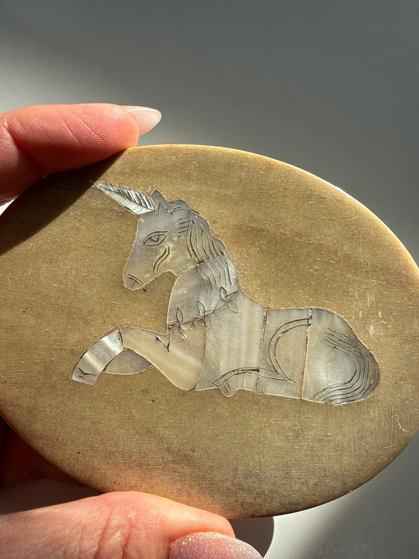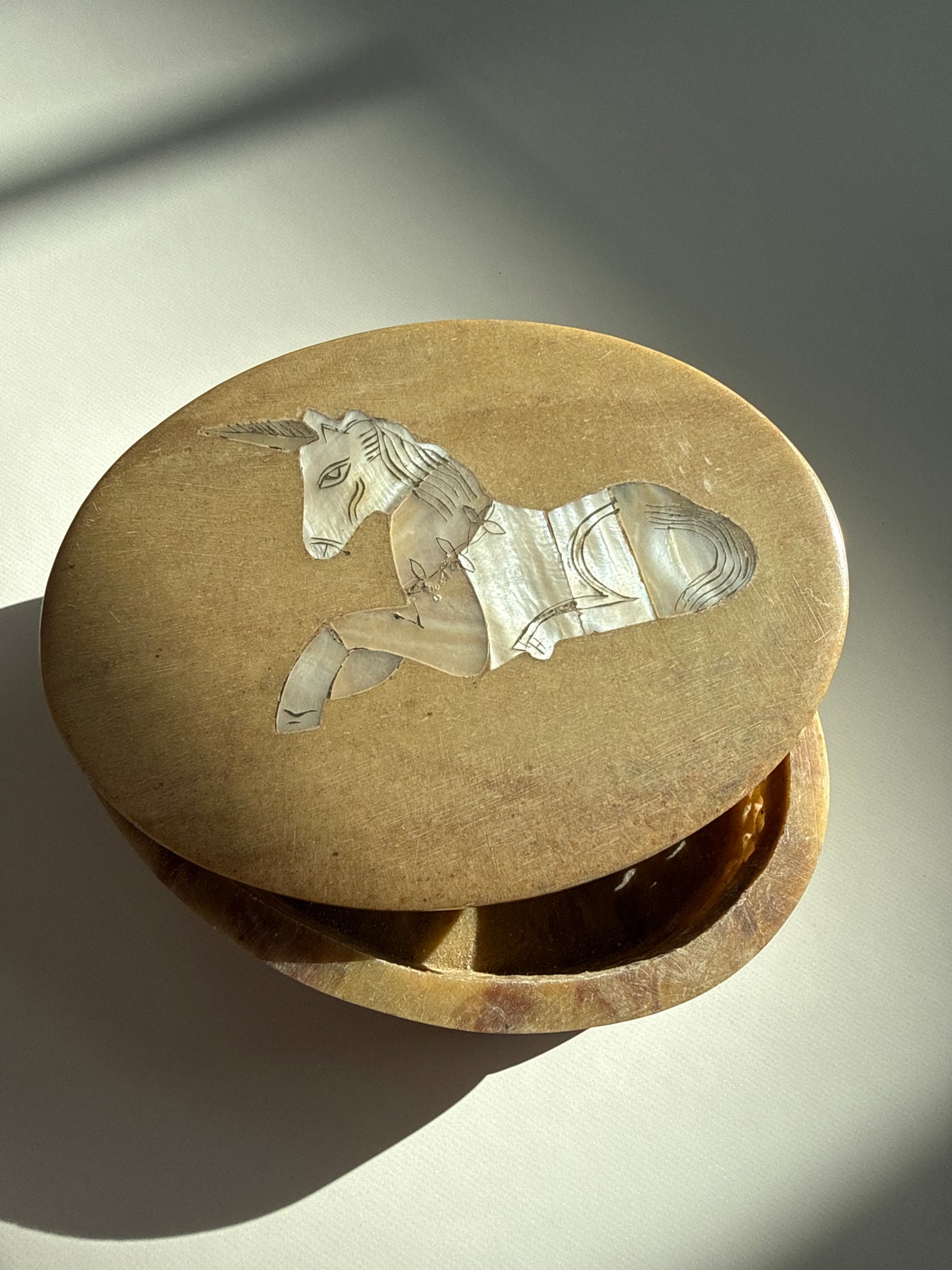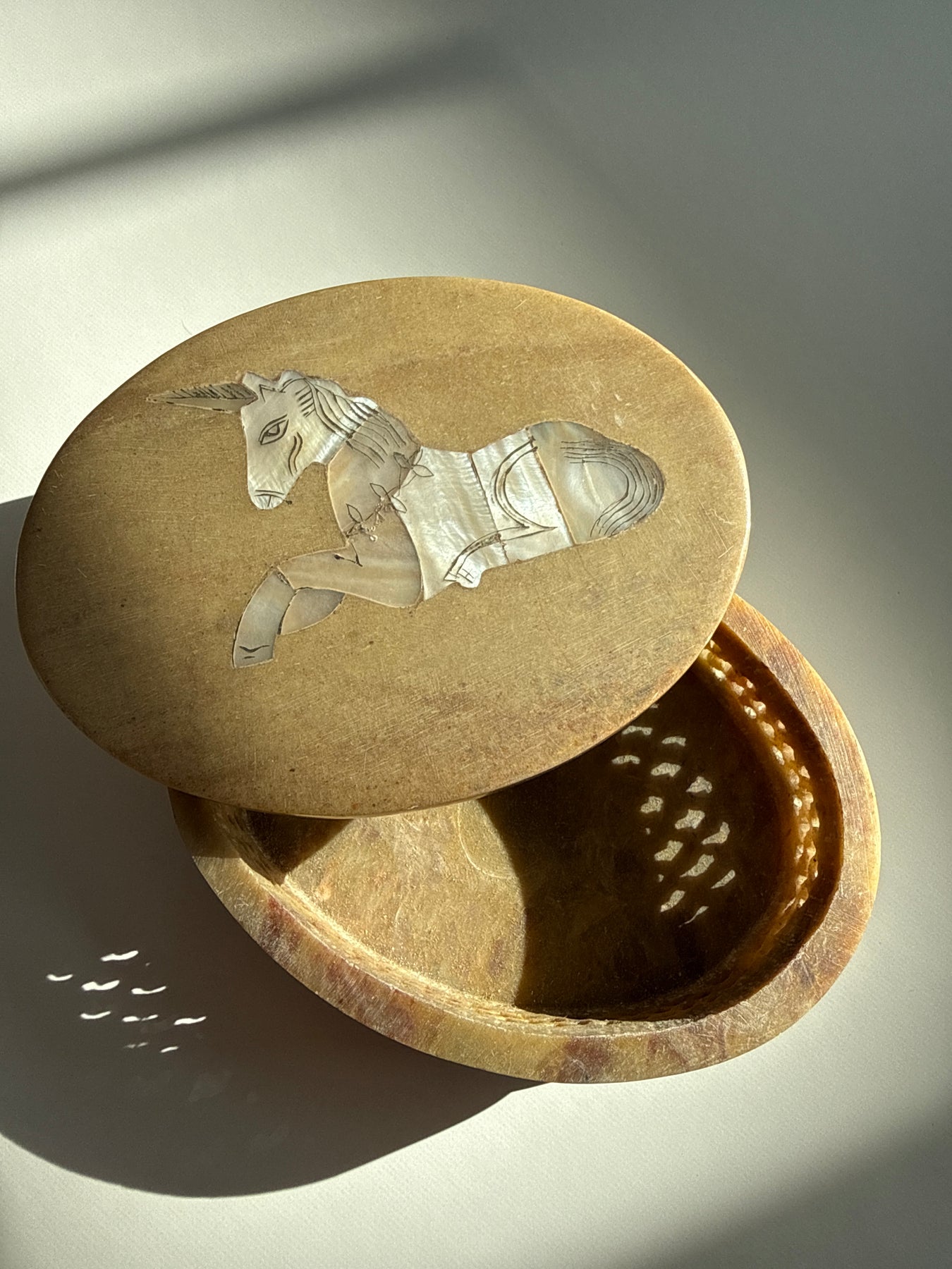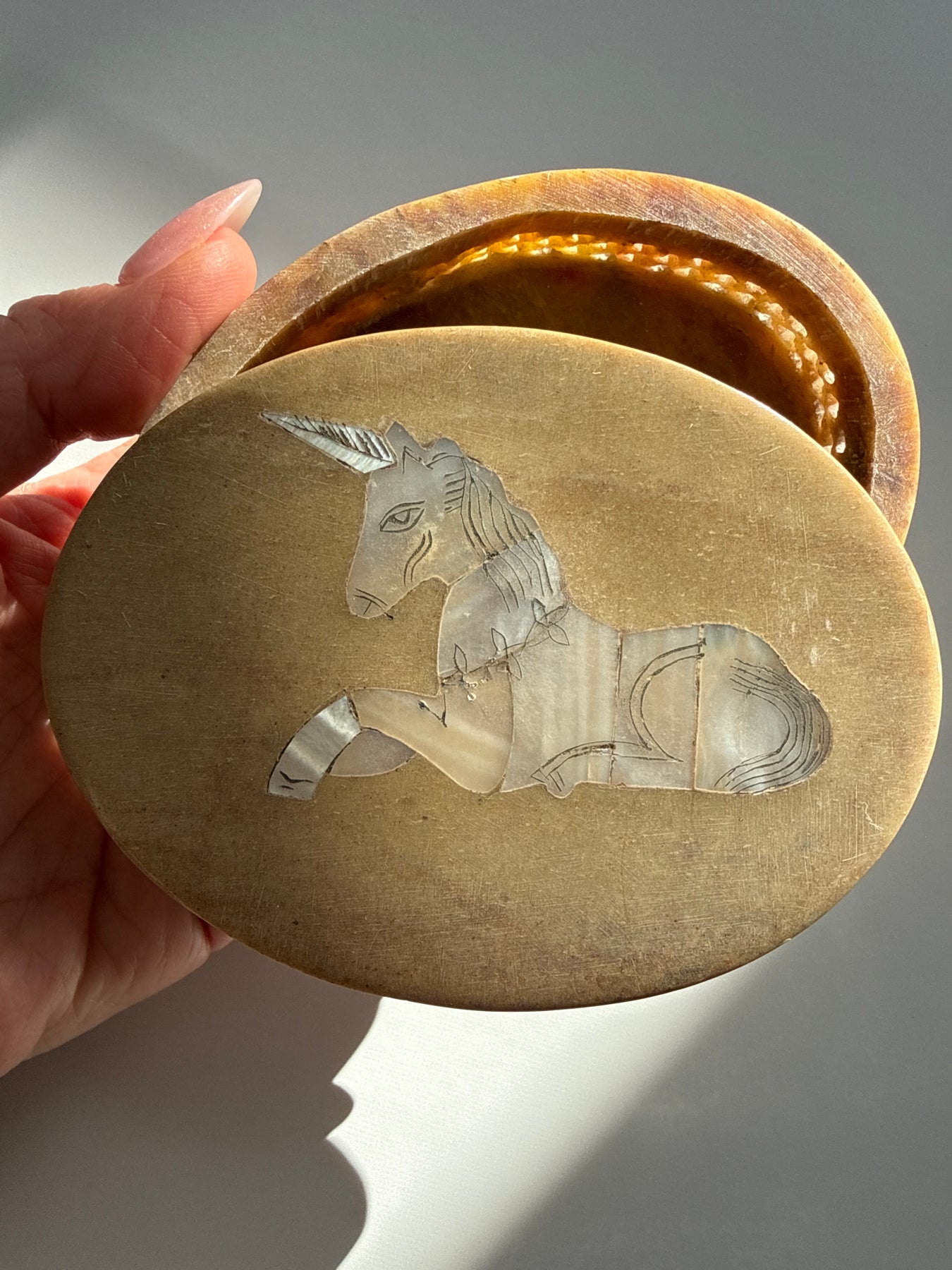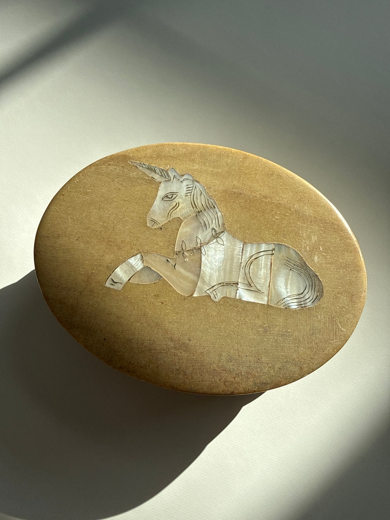 This piece carries the quiet symbolism of the unicorn, a timeless emblem of intuition, protection, and faith restored. The Mother of Pearl unicorn inlay on the lid reflects light softly, creating a subtle iridescence that feels soothing rather than flashy. The weight and smoothness of the stone give the piece a grounded presence, making it feel steady in the hands and calming in a space.