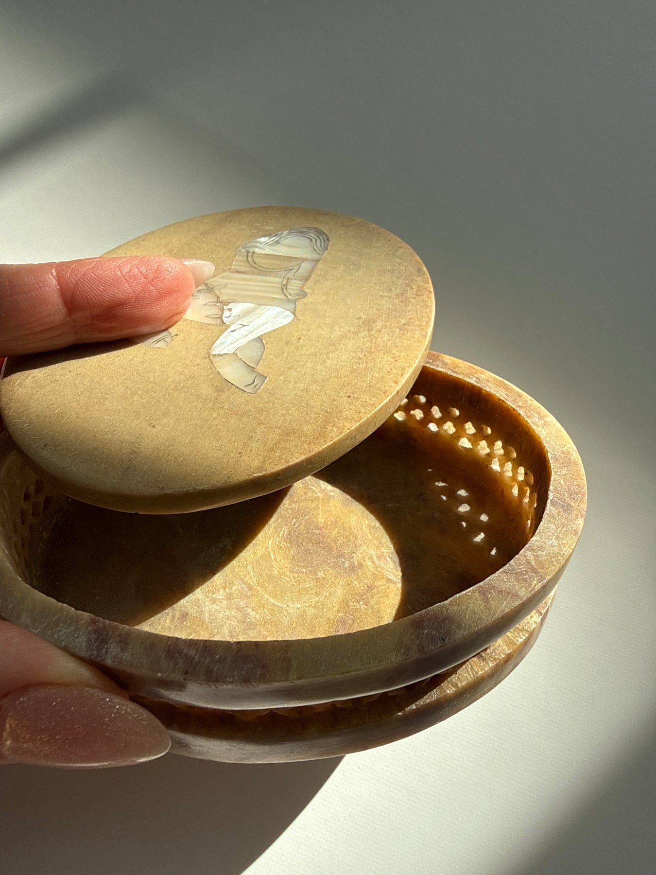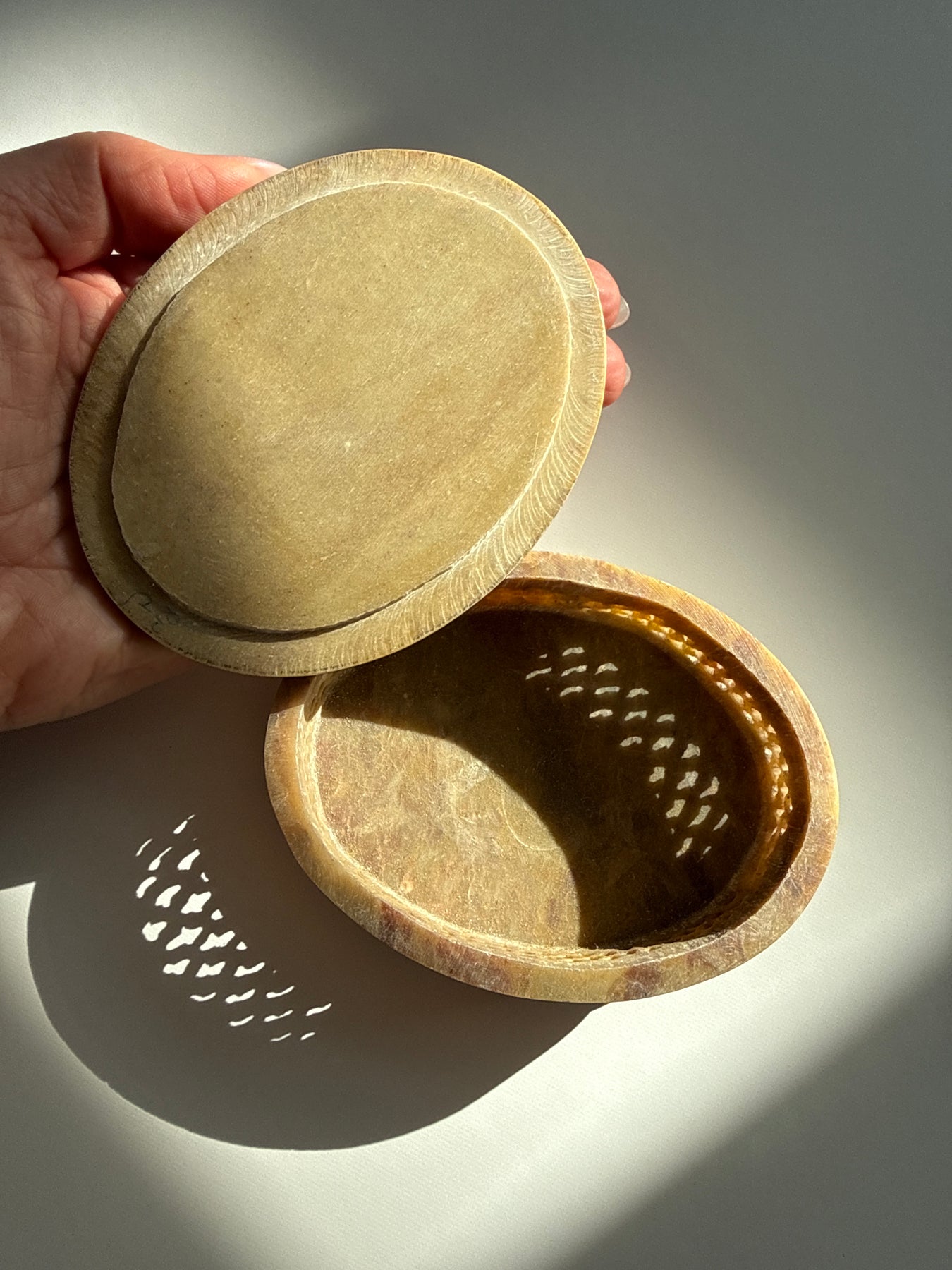 Each box is naturally unique, with variations in color, pattern, and luster that come from the stone itself. These differences are part of what give each piece its character and individuality. This is an object meant to be lived with, returned to, and touched often, especially during moments when softness, trust, and grounded magic matter most.