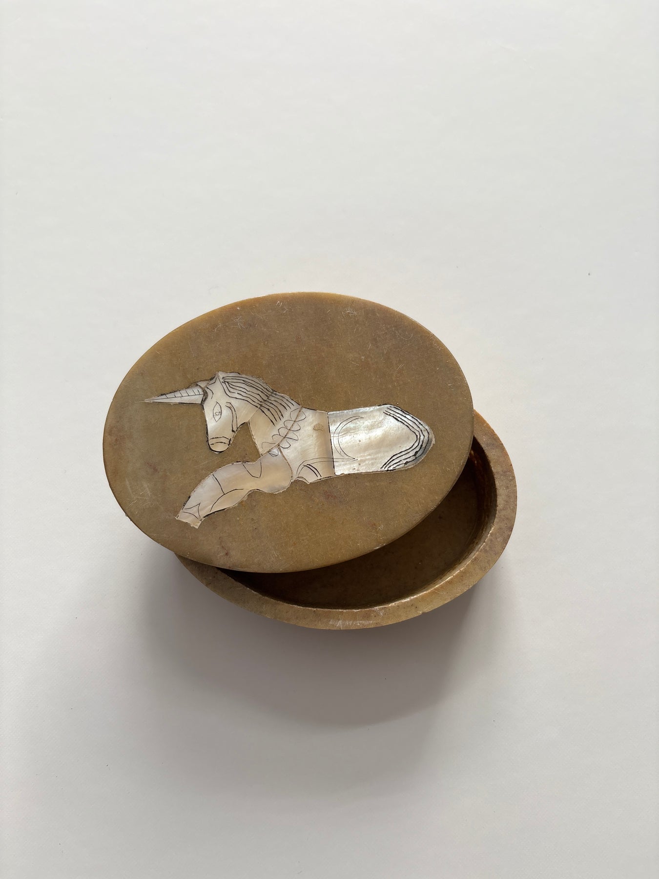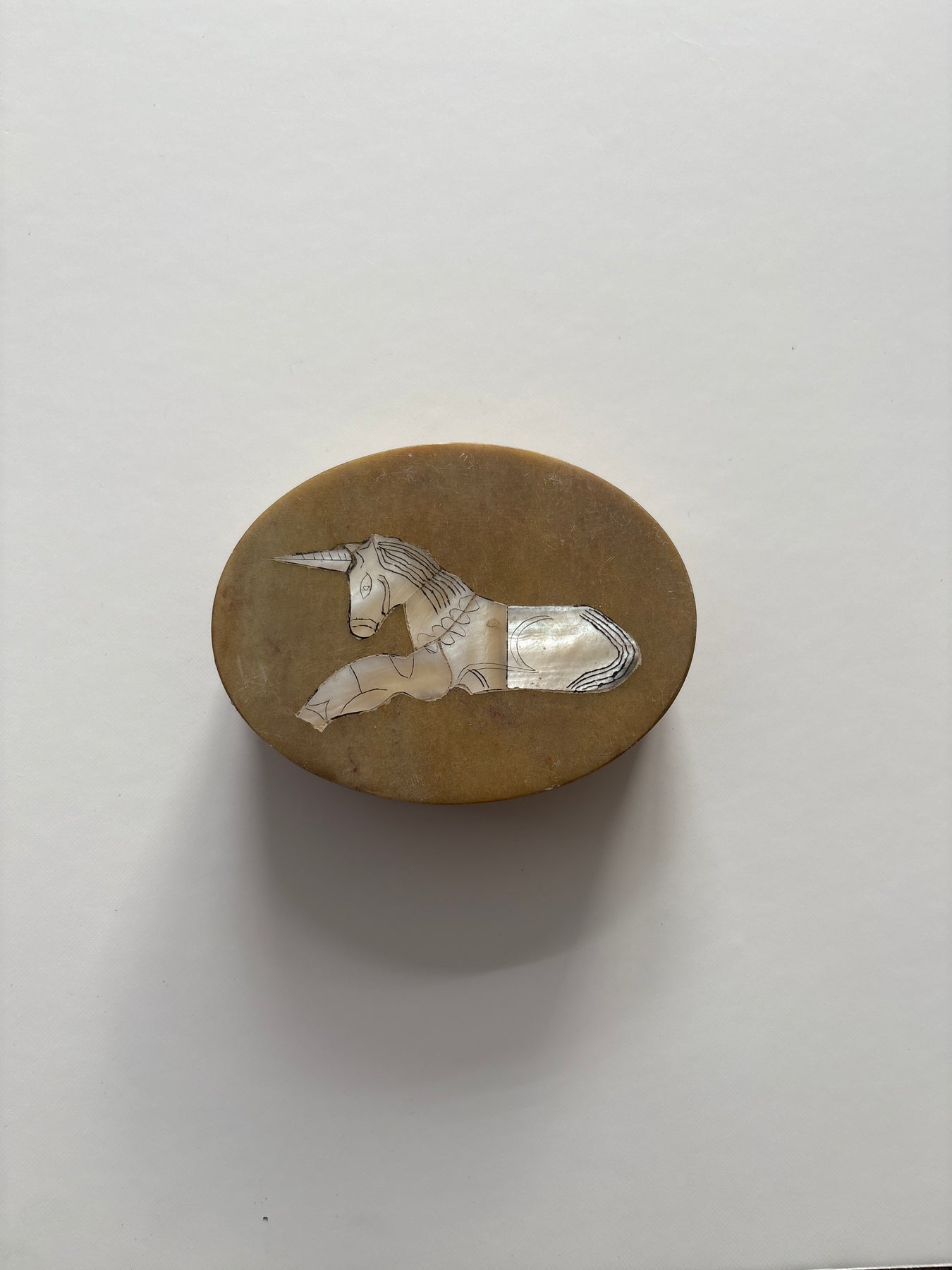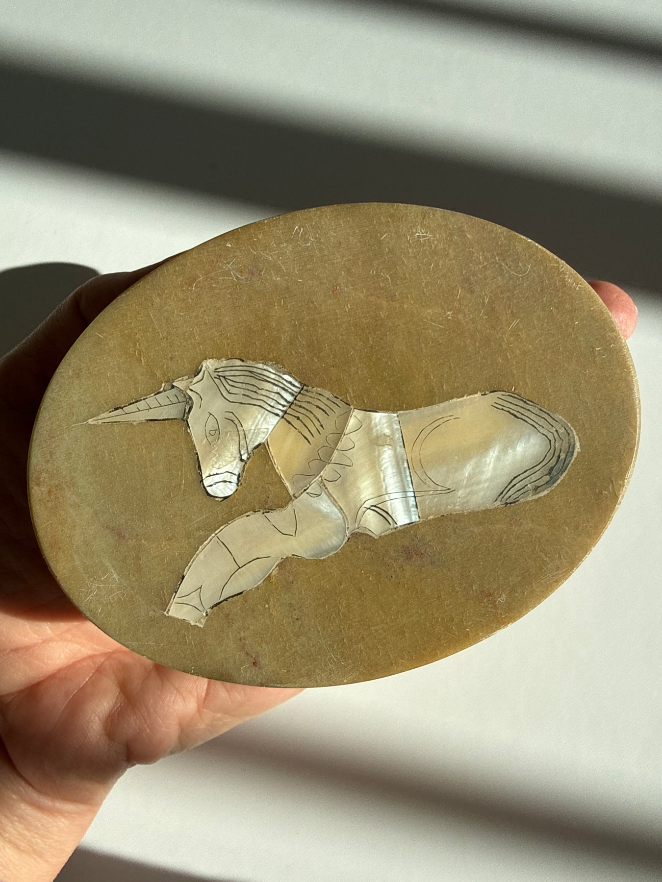 This piece carries the quiet symbolism of the unicorn, a timeless emblem of intuition, protection, and faith restored. The Mother of Pearl unicorn inlay on the lid reflects light softly, creating a subtle iridescence that feels soothing rather than flashy. The weight and smoothness of the stone give the piece a grounded presence, making it feel steady in the hands and calming in a space.