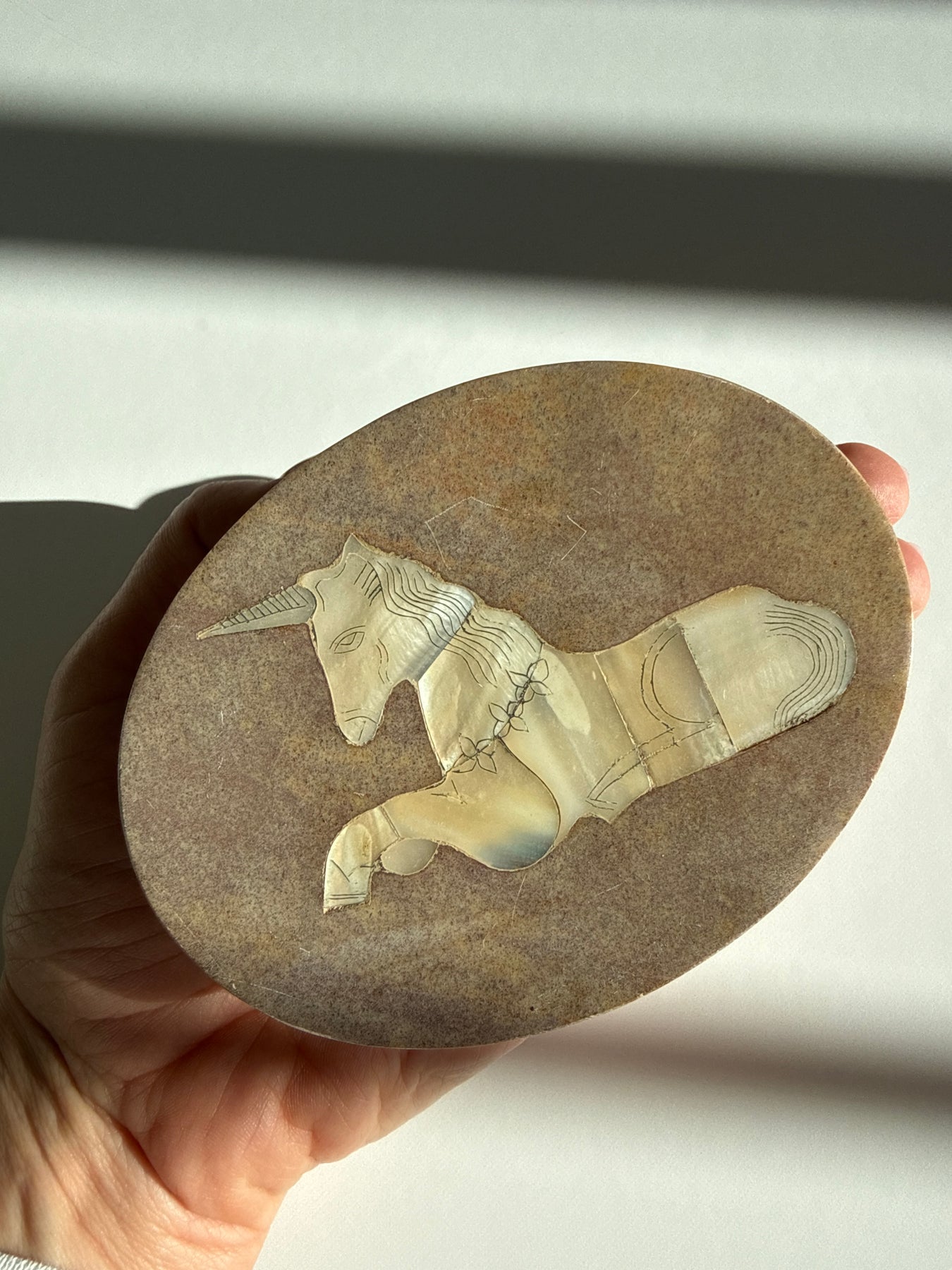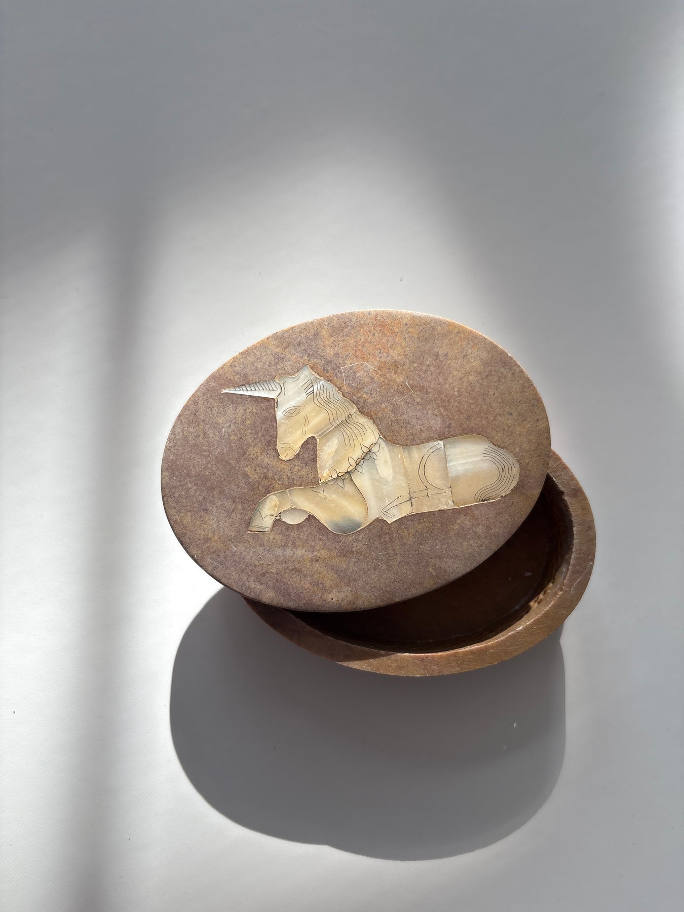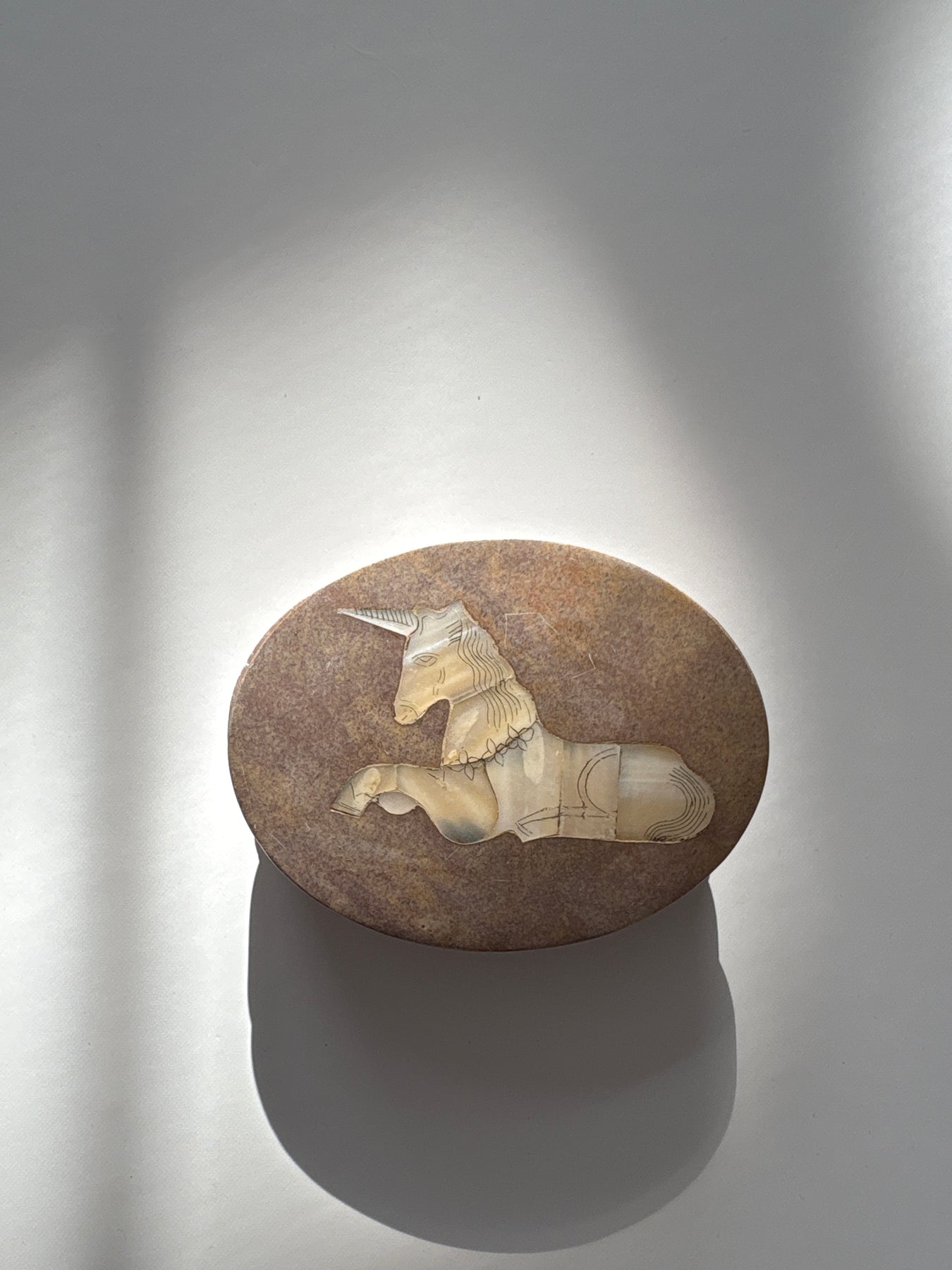 This piece carries the quiet symbolism of the unicorn, a timeless emblem of intuition, protection, and faith restored. The Mother of Pearl unicorn inlay on the lid reflects light softly, creating a subtle iridescence that feels soothing rather than flashy. The weight and smoothness of the stone give the piece a grounded presence, making it feel steady in the hands and calming in a space.