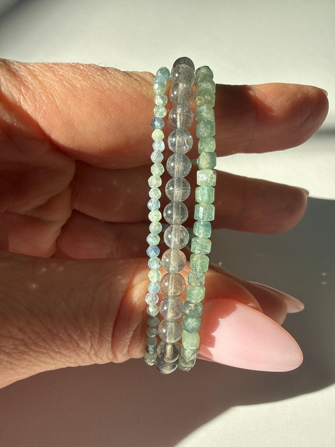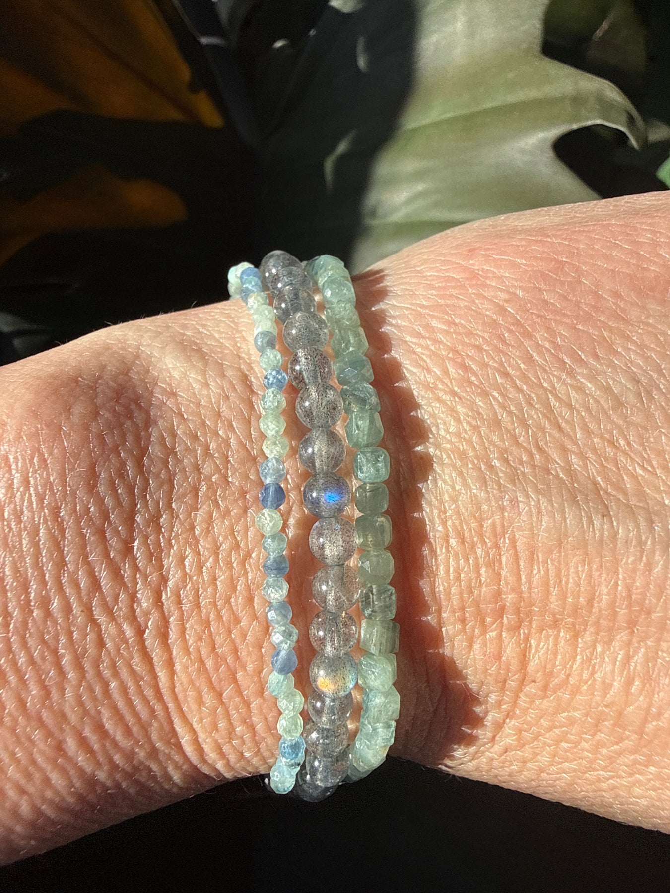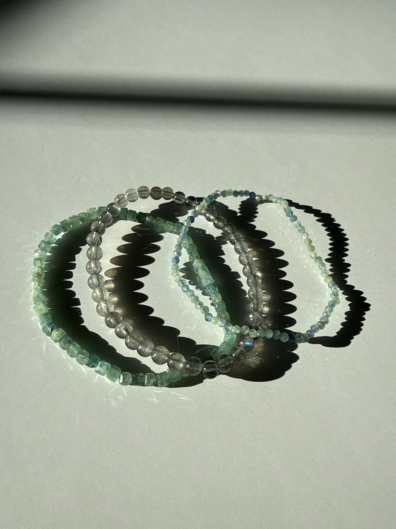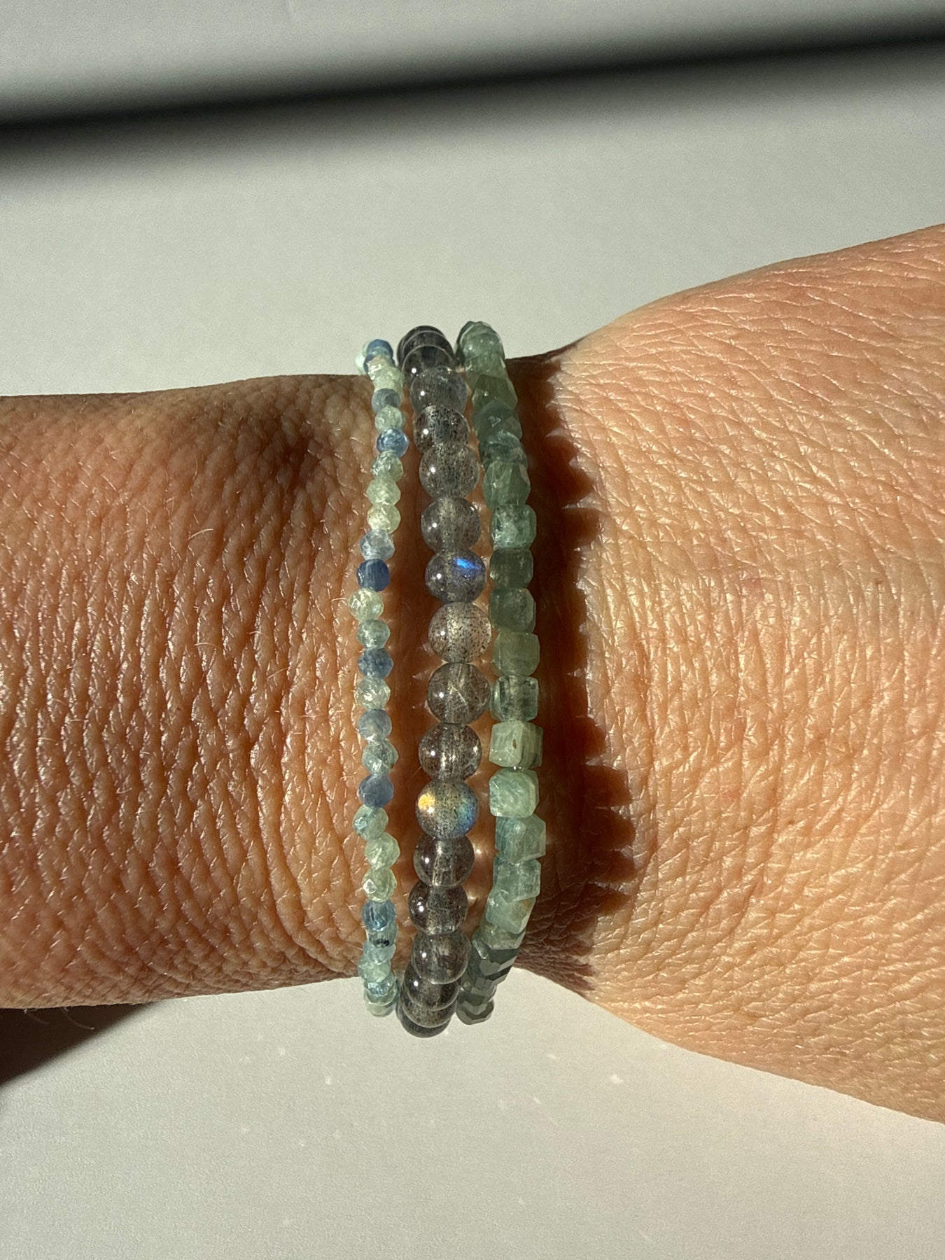 This listing is for one stack of three bracelets: 4 millimeter Labradorite, 3 millimeter Cube Kyanite, and 2 millimeter Faceted Kyanite.